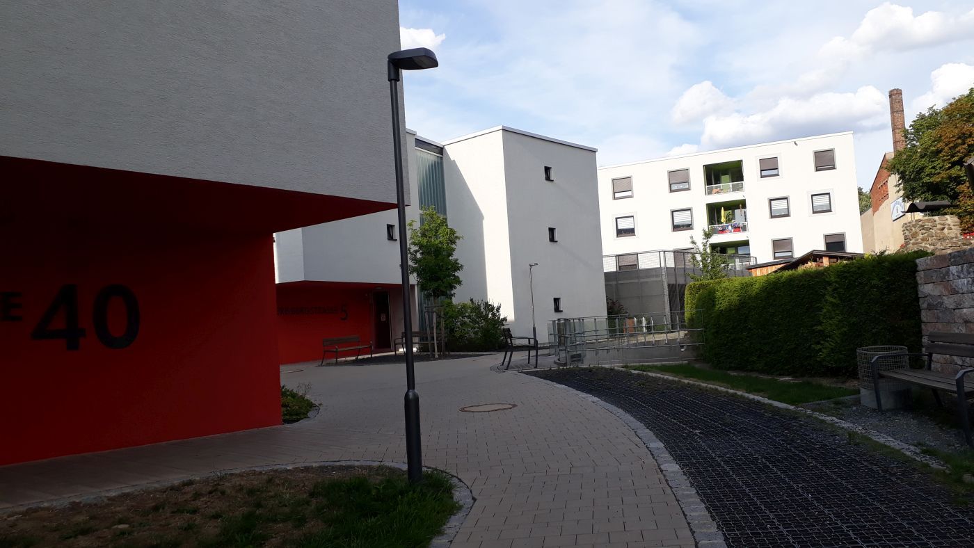 Mitten in der Altstadt von Selb in direkter Nachbarschaft zum Jugend- und Familienzentrum entstand auf einem Grundstück mit großem Geländeunterschied eine Wohnanlage mit 24 Wohnungen für junge Familien. Der Entwurf konnte mit drei locker angeordneten Baukörpern überzeugen. Die jeweils zwei-bündig organisierten Wohngebäude werden über ein Treppenhausatrium erschlossen. Differenziert gestaltete Platzbereiche und Wegeverbindungen sowie die Einbeziehung eines bisher verrohrten Bachlaufs eröffnen Möglichkeiten zum Spielen und Kommunizieren.